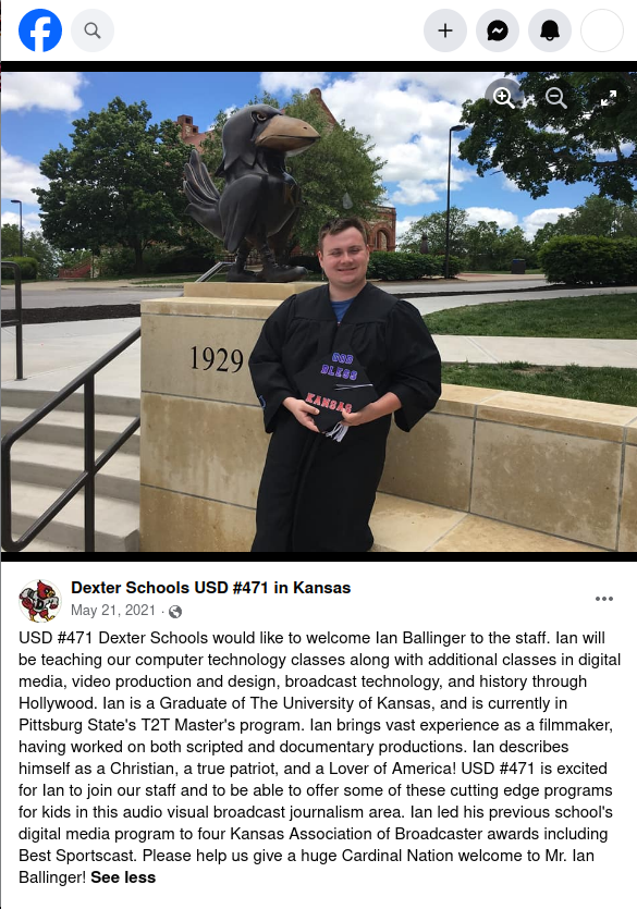 We learned learned that Ian Ballinger ended up teaching computers, media, and social studies related classes at various middle and high schools in Kansas. After his initial doxxing we though he would get removed from the classroom, not just due to his nazi posts…