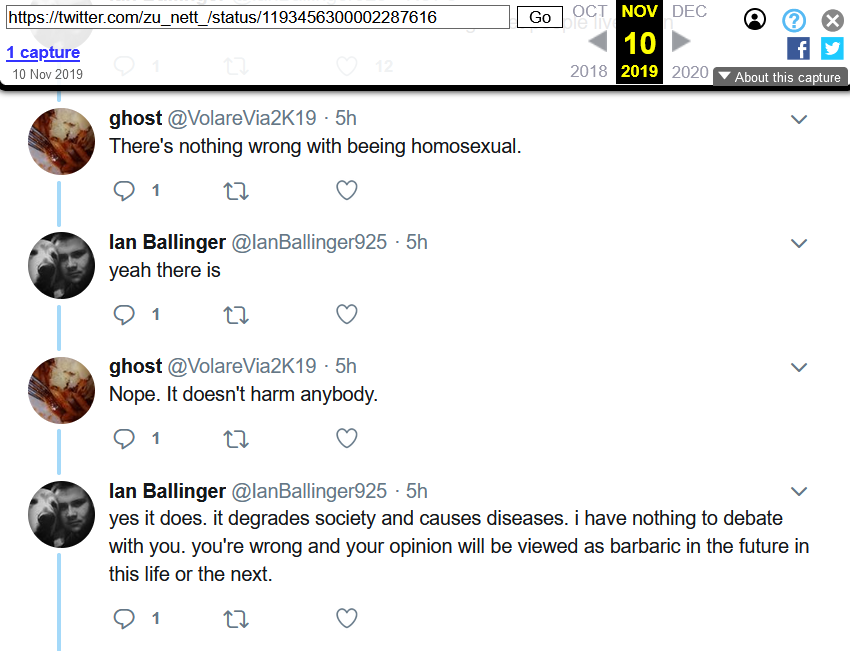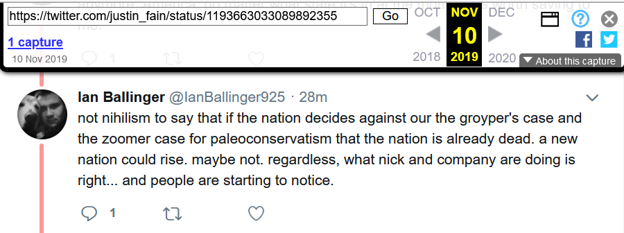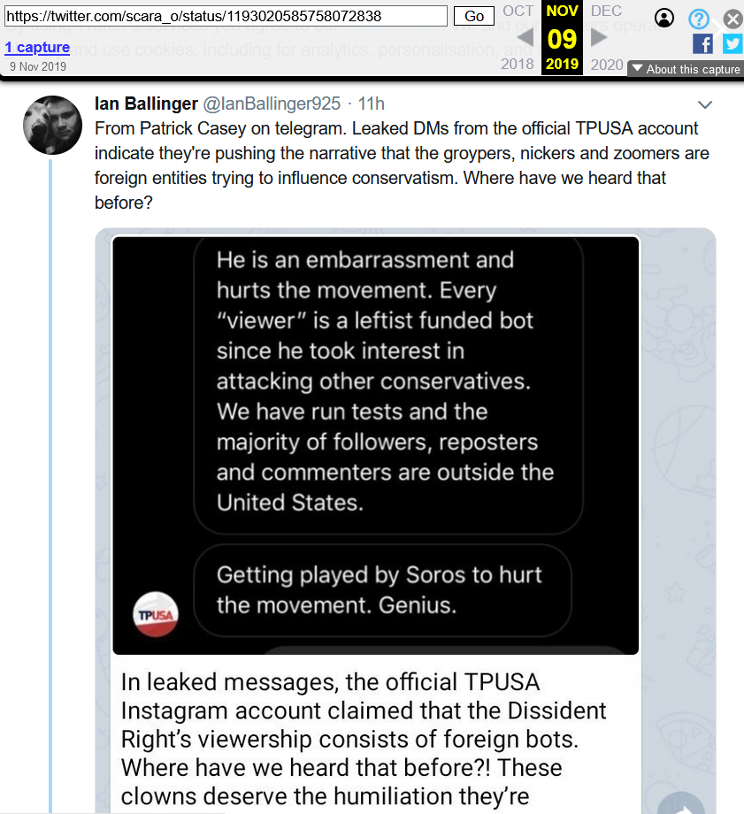 Ian Quaid Ballinger also was pretty open about both TPUSA and groyper stuff on his personal Twitter account. And, overall, doesn’t seem to care that he’s posting white nationalist stuff on main.