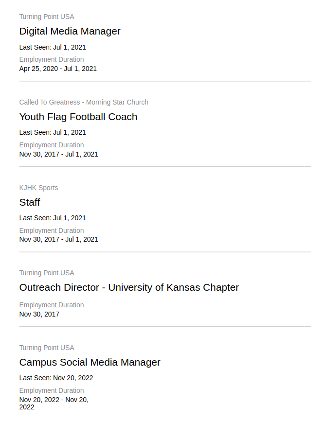 Between 2018-2022, Ian Ballinger was a student at the University of Kansas involved in both TPUSA and Young Americans for Liberty. And, according to his old LinkedIn profile, he was the outreach director and social media manager for KU’s TPUSA chapter.