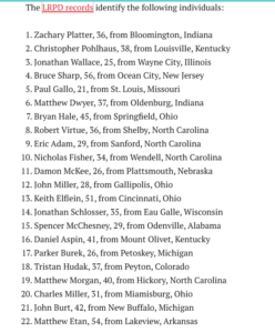 Attached below is the list of (20) blood tribe members pulled over on Dec. 6, 2025. Please alert your friends and family (especially queer folk) that there is an active nazi in the Bloomington Community. Check links below for more info on Zachary: